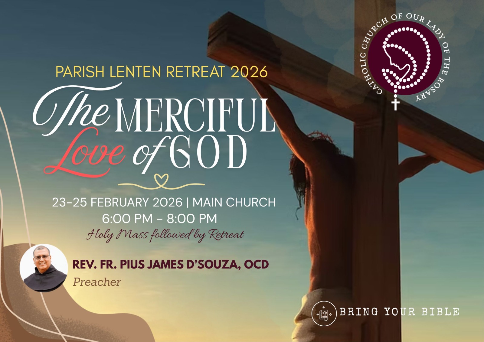Parish Lenten Retreat on 23-25 February starting with a Holy Mass at 6:00PM followed by retreat preached by Fr. Pius James D’Souza, OCD. All are invited to attend.