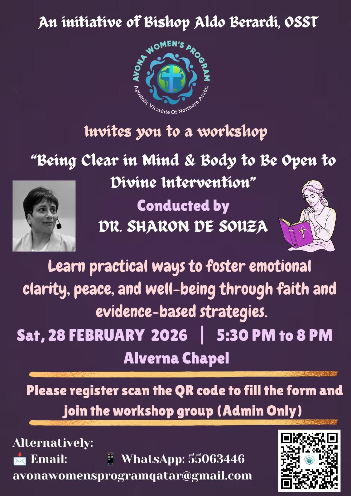 The AVONA Women’s Program invites all women to an Emotional Regulation Session entitled “Being Clear in Mind & Body to Be Open to Divine Intervention,” given by Dr. Sharon De Souza on February 28, 2026, from 5:30 to 8:00 PM at the Alverna Chapel. To register, please scan the QR code posted on the notice boards.